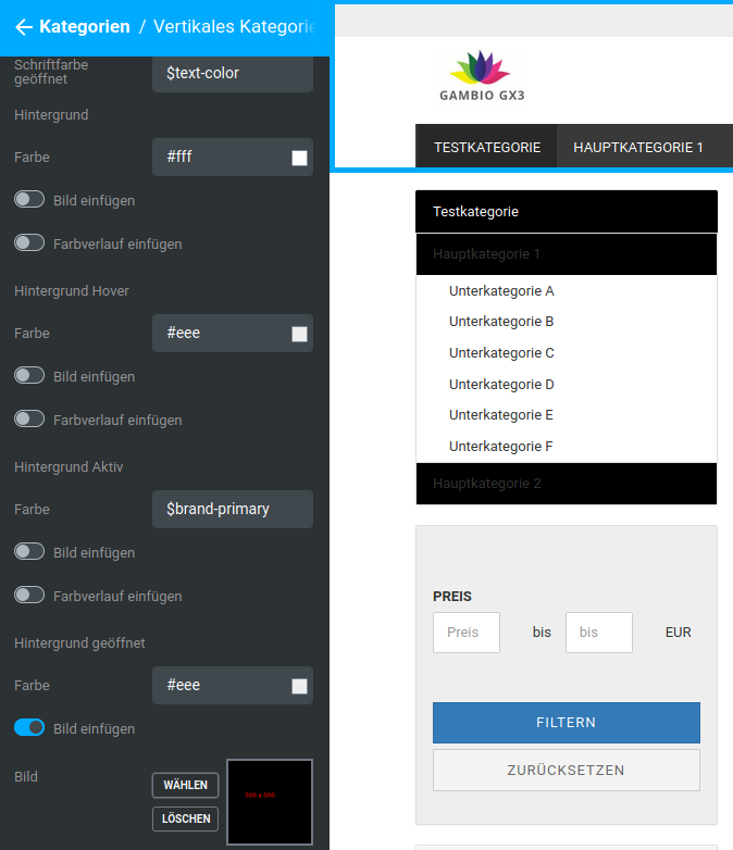 | Bild einfügen | Hintergrundbild der Hauptkategorien im vertikalen Kategoriemenü |