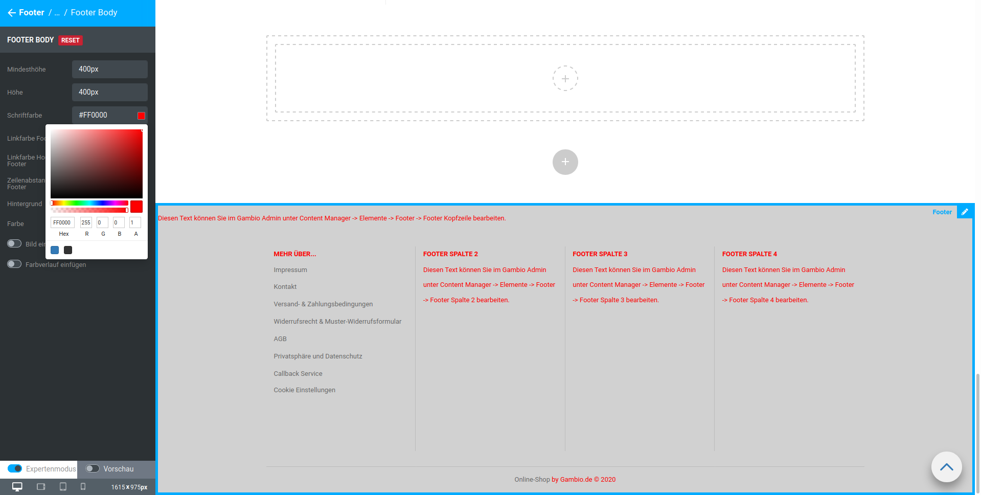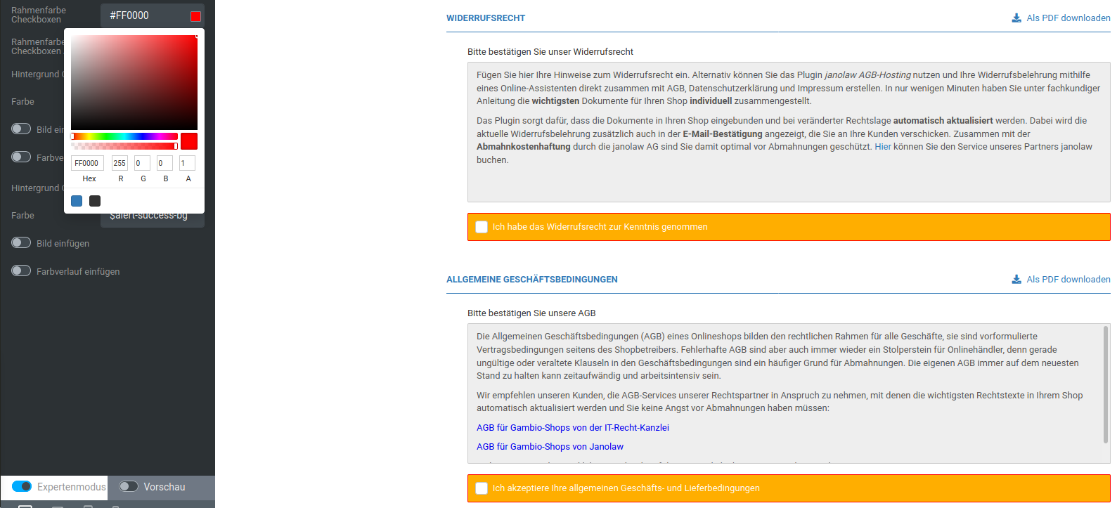 | Textfarbe | Wähle die gewünschte Textfarbe aus, indem du in das Feld bzw. Vorschau-Symbol klickst oder trage wahlweise den Farbcode direkt ein. |