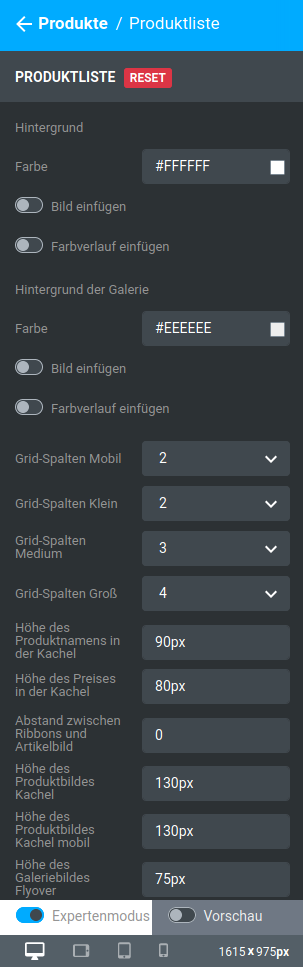 | Grid-Spalten Medium | Anzahl der Grid-Spalten des Kategoriespalten-Bereichs für mittelgroße Darstellung, typischerweise Tablet im Landscape/Quer-Format |