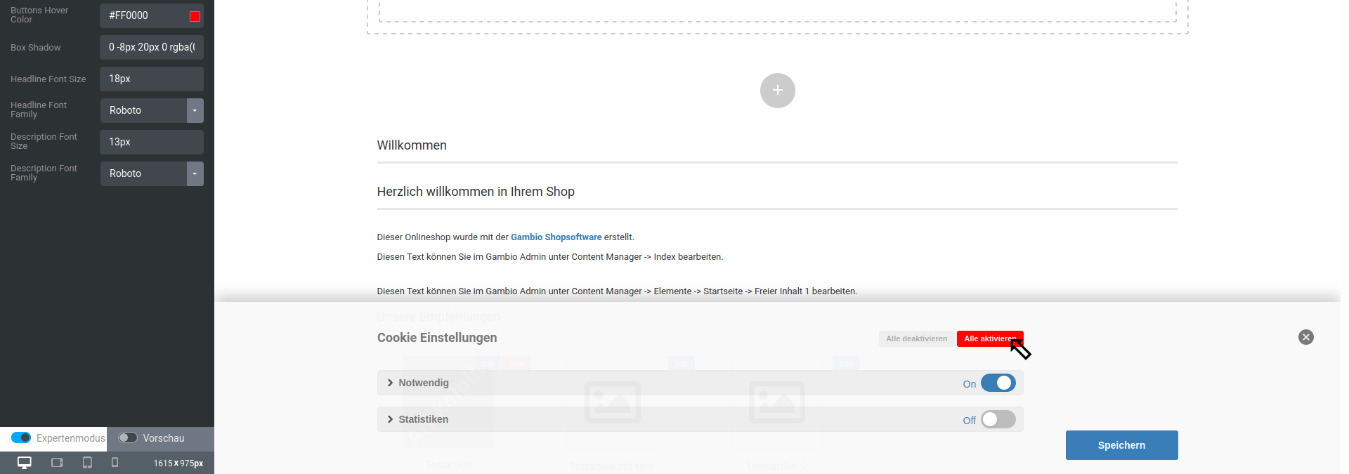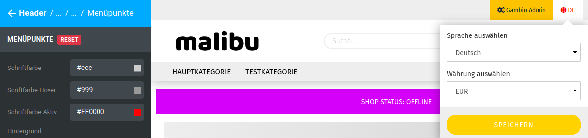 Wird ein Theme aktiviert, wird es im Shop verwendet. Der Shop ist also nach außen mit allen Grafik-Einstellungen zu sehen, die im aktiven Theme vorgenomen worden sind.