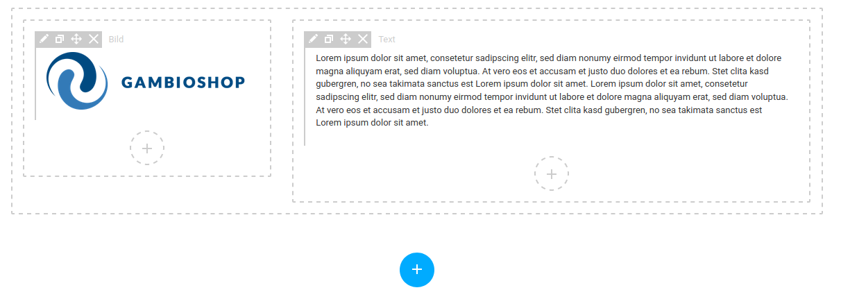 Unterhalb der angezeigten Sektionen kann über einen Klick auf das in der Abbildung hervorgehobene Plus-Zeichen eine weitere Sektion hinzugefügt werden. Innerhalb der Spalten wird mit einem Klick auf das entsprechende Plus der Widget-Bereich des StyleEdits aufgerufen.