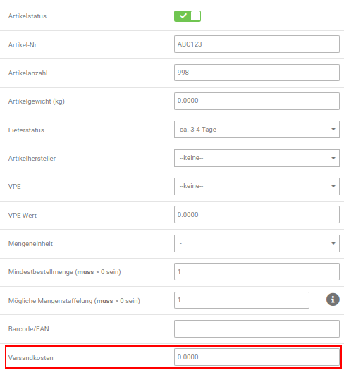 Bei der Verwendung des Moduls Artikelversandkosten sollte in jedem Fall eine Staffelung eingetragen werden. Anderenfalls kann es im Bestellvorgang zu einer Fehlermeldung kommen und das Modul ist nicht verfügbar.